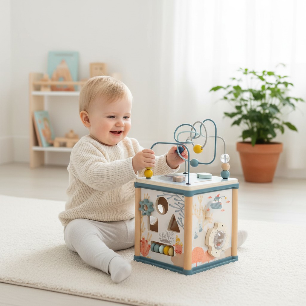 - Aktivnostna kocka iz robustnega lesa s 5 igralnimi površinami.