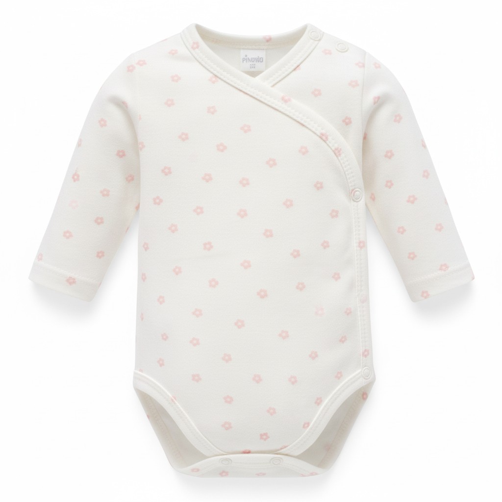Bombažen bodi št. 62 z dolgimi rokavi. Bodi se zapenja na preklop, kar omogoča enostavno oblačenje in slačenje v prvih mesecih.
