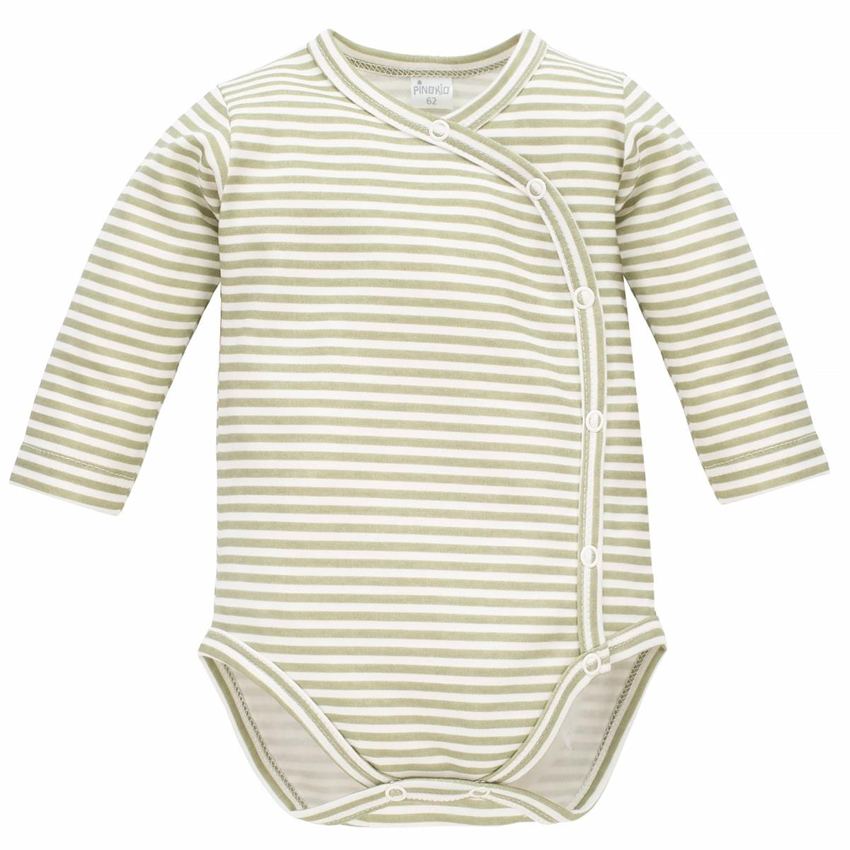 Bombažen bodi št. 62 z dolgimi rokavi. Bodi se zapenja na preklop, kar omogoča enostavno oblačenje in slačenje v prvih mesecih.