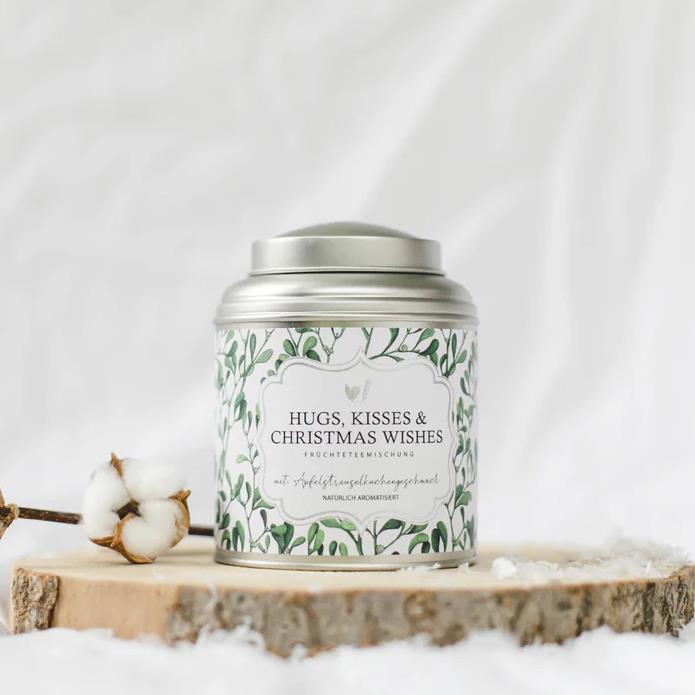 Sadni čaj z naravno aromo jabolčne pite shranjen v prikupni pločevinki s prazničnim motivom in napisom "Hugs, Kisses & Christmas Wishes". Idelna ideja za praznična obdarovanja ali za lastna razvajanja.