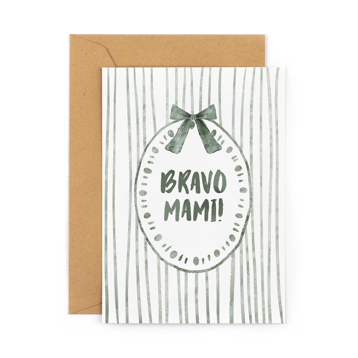 Voščilnica z napisom “BRAVO MAMI” na fine art papirju. Voščilnici je priložena tudi kuverta iz recikliranega papirja. Vaše posvetilo natisnemo na zadnjo stran voščilnice. Velikost voščilnice: 10 x 15 cm. Vsako voščilnico s kuverto zapakiramo v darilno škatlo z napisom "Dobrodošla sreča".