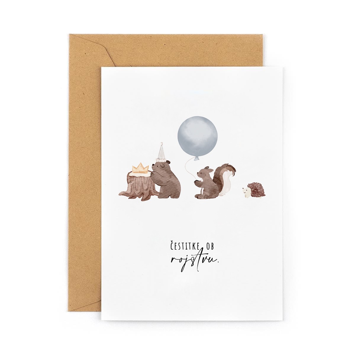 Voščilnica z napisom “Čestitke ob rojstvu” in sličico gozdnih živali na fine art papirju. Voščilnici je priložena tudi kuverta iz recikliranega papirja. Vaše posvetilo natisnemo na zadnjo stran voščilnice. Velikost voščilnice: 10 x 15 cm. Vsako voščilnico s kuverto zapakiramo v darilno škatlo z napisom "Dobrodošla sreča".