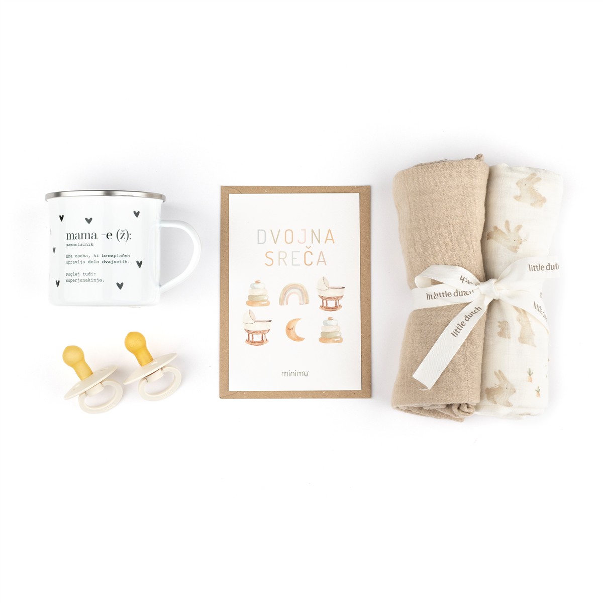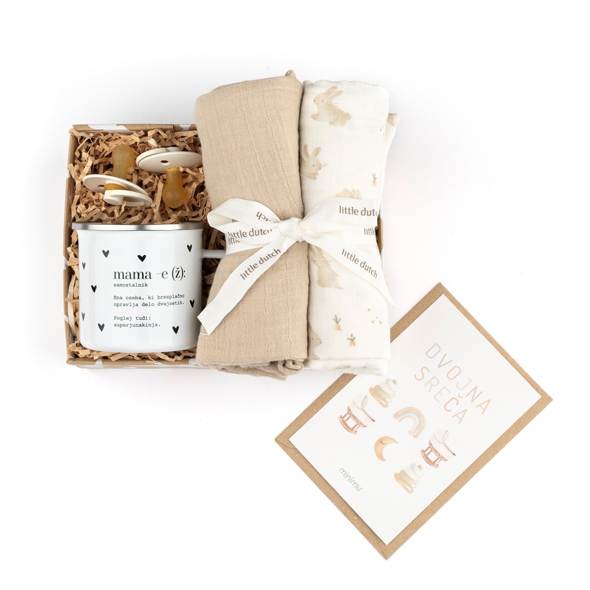 Presenetite mamico in novorojenčka s preprostim, a prečudovitim darilom. Vsi paketi so v nežnih barvah, primerni kot darilo ob rojstvu. Pri vseh paketkih smo poskrbeli, da se vedno najde tudi nekaj za mamico, ki si po porodu nedvomno zasluži pozornost, s katero se bo lahko pocrkljala. Naši paketki so skupek različnih, skrbno izbranih manjših darilc, ki tvorijo čudovito celoto. Vsak paket je zapakiran v lično embalažo, ki prikliče toplino v srce že ob samem odpiranju darila. Naše pakete lahko naročite kot telegram v porodnišnico (dostavljamo v porodnišnico Ljubljana, Kranj, Jesenice, Postojna, Brežice, Celje, Maribor, Izola, Slovenj Gradec, Murska Sobota, Novo mesto, Šempeter pri Novi Gorici, Trbovlje in Ptuj), kot darilo na prejemnikov naslov ali k sebi domov in ga ob prvem obisku novorojenčka prinesete s seboj kot darilo. Pri dostavi lahko izberete hitro pošto, ki paket dostavi v nekaj urah po celi Sloveniji (priporočamo za naročilo telegramov v porodnišnico) ali 24 urno dostavo, ki je primerna predvsem pri naročanju na dom. Telegram porodnišnica.