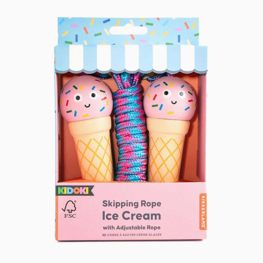 Prisrčna kolebnica Kidoki z ročaji v obliki sladoleda – iz naravnih materialov, z nastavljivo dolžino in dizajnom, ki spodbuja gibanje in igro na prostem.