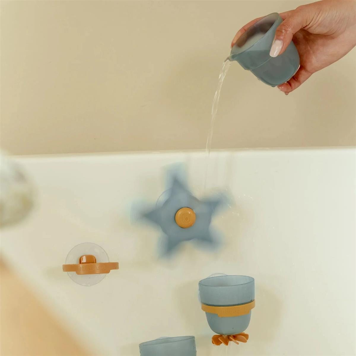 Komplet vsebuje štiri elemente, opremljene s priseski – vrteče se kolo v obliki morske zvezde, dve kopalni skodelici in skodelico za izlivanje. Preprosto jih pritrdite na steno kadi ali tuša, nato zlijte vodo v zvezdo in opazujte, kako se začne kolo vrteti.