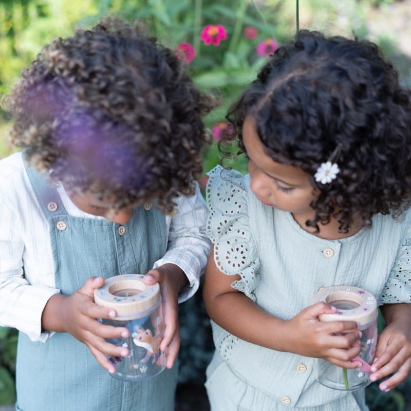 Za male raziskovalce, ki jih očara vsaka pikapolonica in metulj! S kozarcem Fairy Garden za opazovanje žuželk bodo otroci lahko varno raziskovali čudovit svet drobnih bitij okoli sebe. Kozarec ima lesen pokrov s povečevalnim steklom, ki razkrije še tako majhne podrobnosti, ter prozorno plastiko, ki omogoča pogled z vseh strani. Pokrov se enostavno odstrani, zračne luknje pa poskrbijo, da imajo žuželke dovolj zraka. Kozarec krasijo vesele ilustracije, priložena pa je tudi kartica z žuželkami, na kateri lahko otrok odkljuka vse, ki jih je že opazoval.