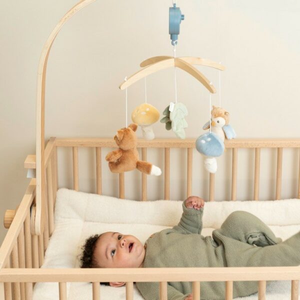Prisrčen lesen glasbeni vrtiljak ima pomirjajoč učinek na dojenčka – zahvaljujoč nežni uspavanki.