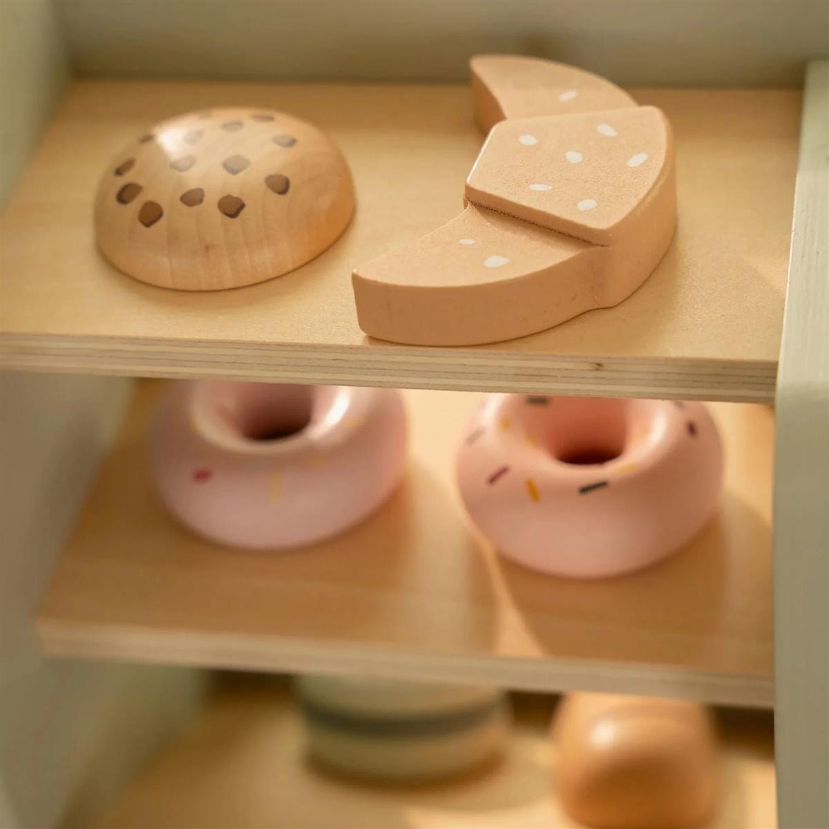 V kompletu so aparat za kavo in čaj, prostor za shranjevanje skodelic ter omarica za razstavljanje vseh “slaščic”. Igra spodbuja domišljijo, ustvarjalnost in socialne veščine, hkrati pa prinaša ure zabave in nežnih trenutkov skupne igre.