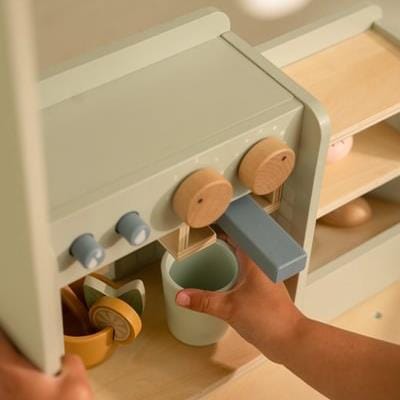 Spoznajte prikupni kavni kotiček Little Dutch – popoln za male bariste! Otroci lahko pripravijo kavo ali čaj, pritisnejo gumbe, vstavijo kapsulo in postrežejo z nasmehom. Vse, kar potrebujejo za pravo mini kavarnico doma!