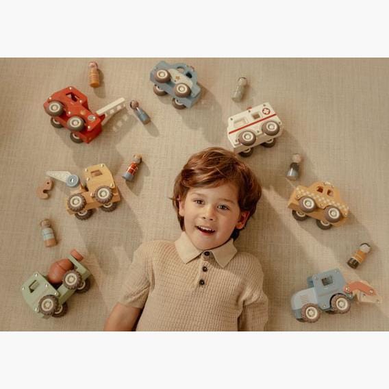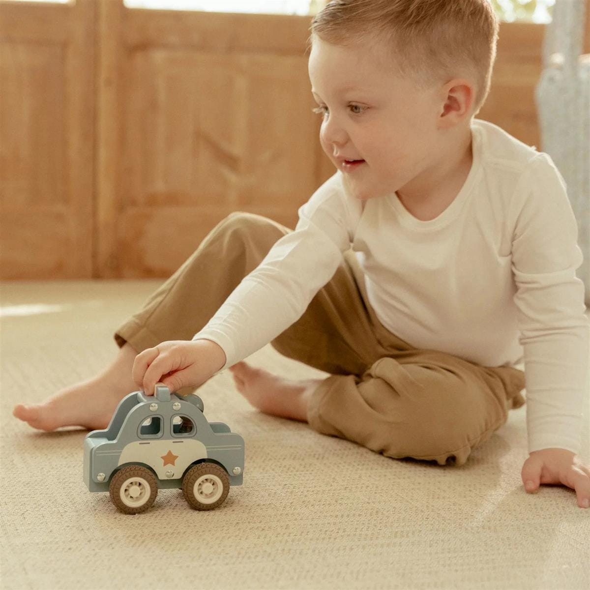 Nujno sporočilo – v mestu se dogaja nekaj zanimivega! S lesenim policijskim avtomobilom Little Dutch se otroci lahko podajo na vznemirljive misije, lovijo poredne roparje ali pomagajo v stiski. Policijski avto ima gumijasta kolesa, ki zagotavljajo gladko in tiho vožnjo, ter figurico pogumnega policista, ki je vedno pripravljen posredovati.