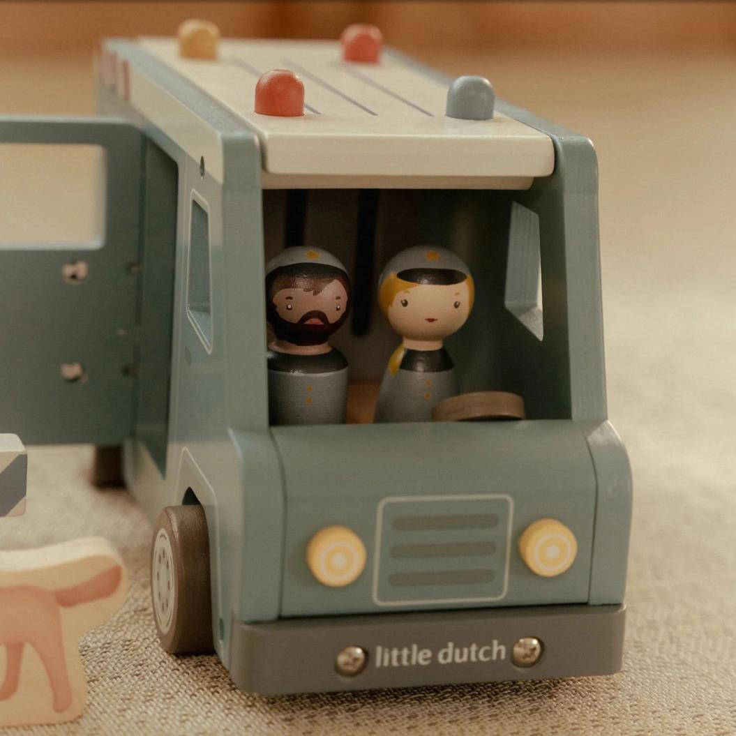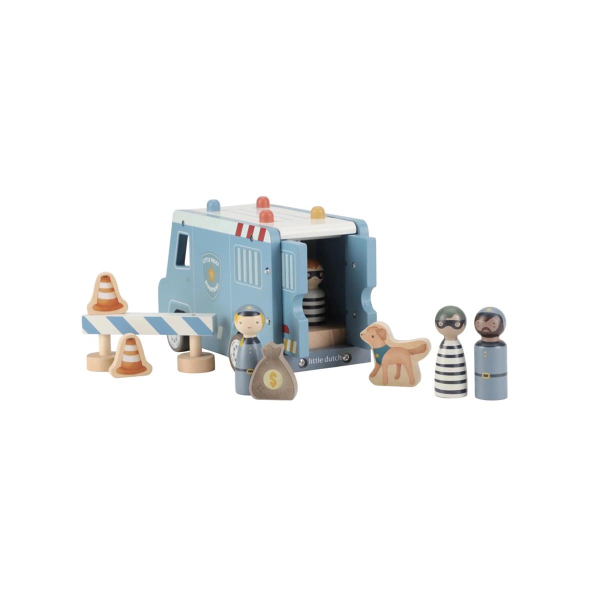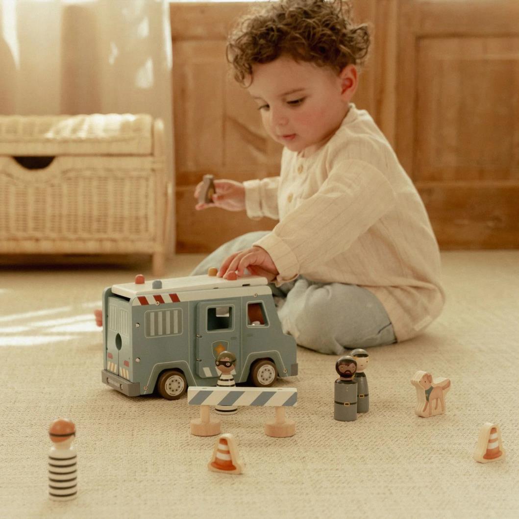 Z lesenim policijskim kombijem bodo mali junaki vedno pripravljeni na akcijo in bodo z veseljem poskrbeli, da bo mesto varno. Set vključuje štiri figure (dva pogumna policista in dva zlobna zločinca), zvestega policijskega psa, vrečo z denarjem, stožce in zaporo za pravo akcijsko vzdušje. Kombi ima celico z zložljivimi vrati, tako da bodo zločinci med prevozom na varnem. Od zasledovanja do aretacije – otroci lahko ustvarjajo neskončne zgodbe, pri tem pa razvijajo domišljijo, vlogo skrbi in občutek za pravičnost.