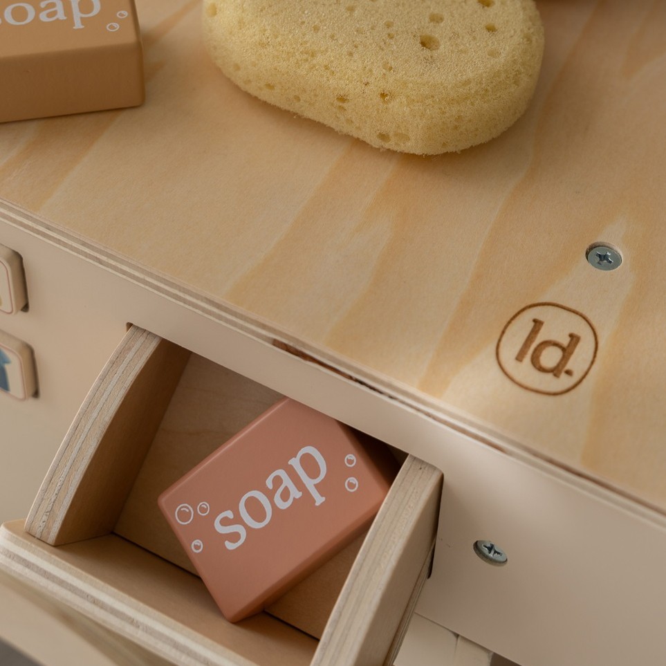 Z lesenim pralnim strojem in koritom Little Dutch postanejo vsakodnevna opravila čisto nova zabava! Ta čudovita kombinirana igrača združuje pralni in pomivalni del, zato lahko otroci najprej »pomijejo« posodo, nato pa »operejejo« oblačila svojih punčk.