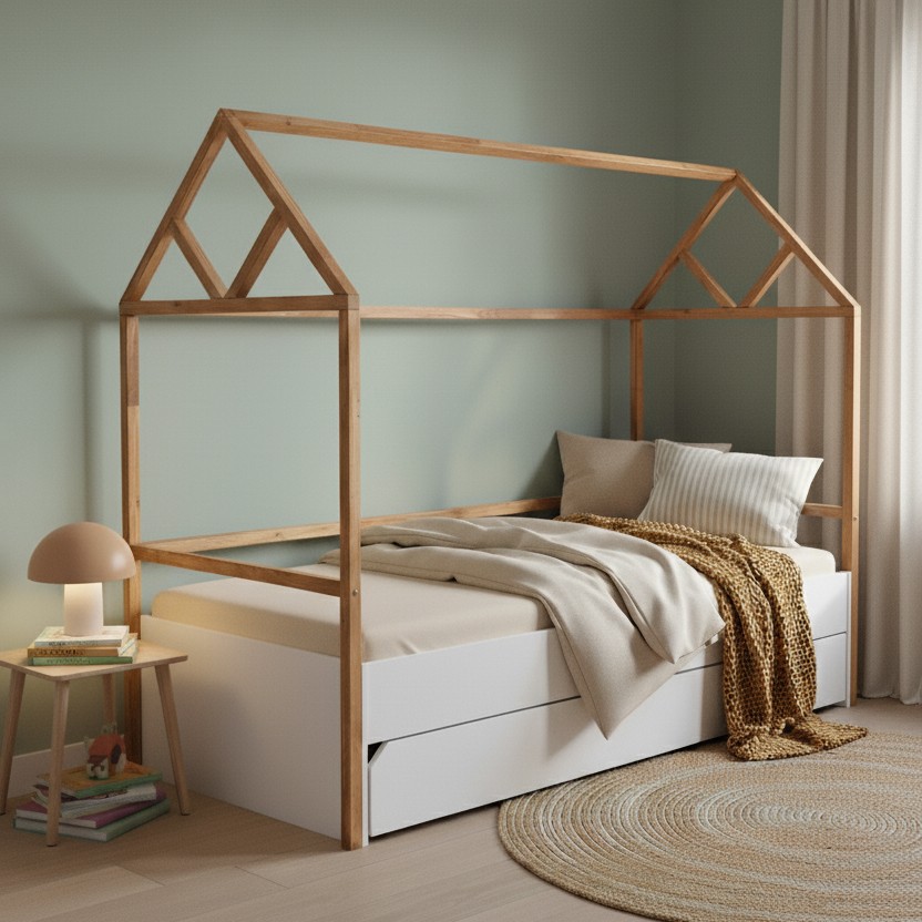 Kot nalašč za starejšega otroka ali najstnika zaradi svojih standardnih dimenzij (200 cm x 90 cm), kar pomeni, da izbira ustrezne vzmetnice in posteljnine ne bo težava. V postelji je izvlečni predal, ki je kot nalašč za shranjevanje posteljnine, lahko pa v notranjost postavite tudi vzmetnico, ki služi kot dodatno ležišče - to je odlična rešitev za brate in sestre ali prenočitvene goste. Predal lahko enostavno izvlečejo tudi otroci. Lepa okrasna in funkcionalna lastnost postelje je hrastov okvir v obliki hiše, na katerega lahko obesite pravljične luči ali različne tkanine. Okvir ima tudi tri vodoravne podporne palice, na katere lahko postavite blazine in ustvarite prijetno mesto za branje.