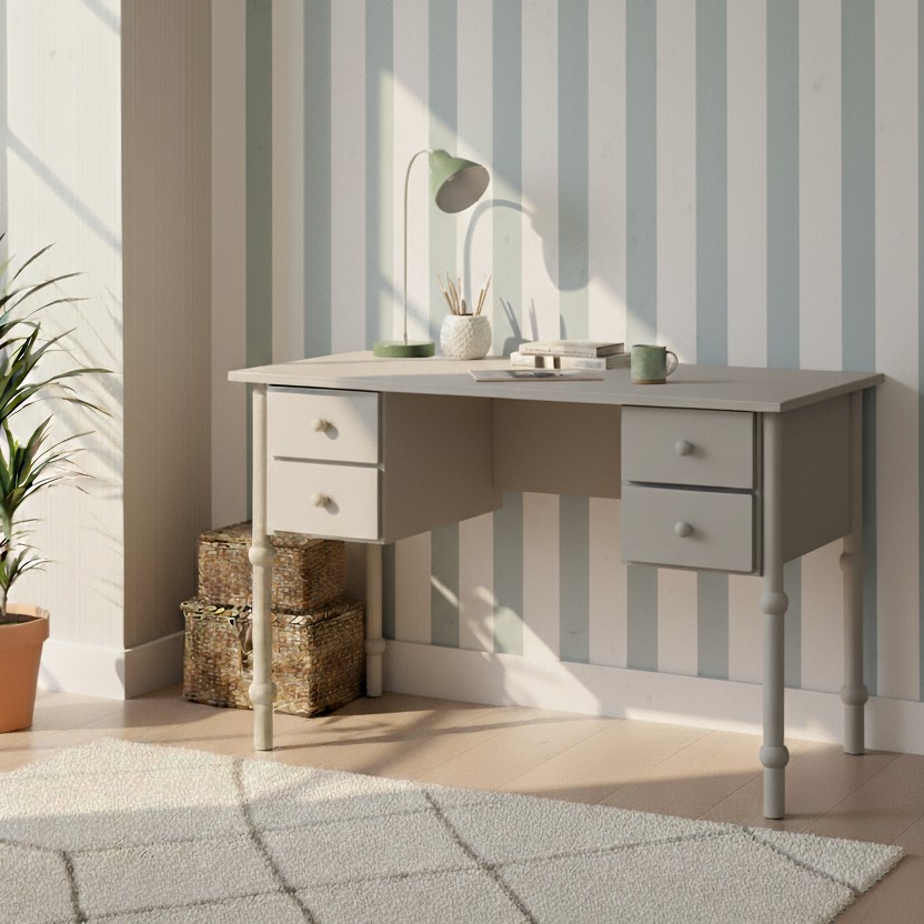 Prikupna miza v retro stilu iz kolekcije Poppy. Miza ima štiri predale z vodili na mehko zapiranje. Na voljo v beli ali olivno sivi barvi.