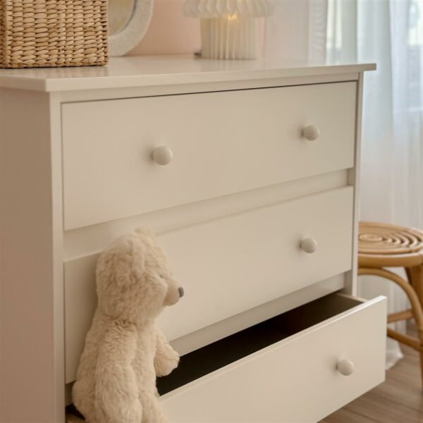 Predalnik s tremi predali White Poppy združuje čudovit dizajn in praktičnost, saj s tremi prostornimi predali ponuja dovolj prostora za organizirano shranjevanje oblačil, igrač ali drugih otroških potrebščin. Njena klasična oblika z igrivimi detajli in elegantnimi lesenimi nogami doda toplino vsaki otroški sobi.