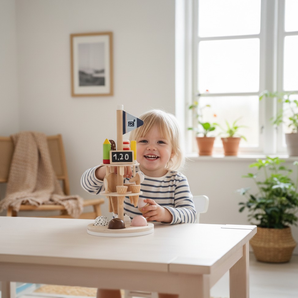 Kompaktno leseno stojalo za sladoled naredi odličen vtis z nežnimi barvami, funkcionalnimi poudarki in številnimi dodatki. Štiri različne vrste sladolednih lizik, tri sladoledne kepice in tri kepice sladoleda, ki jih je mogoče zložiti na enega, lahko enostavno razdelite na tri nivoje stabilnega držala za sladoled. In najboljša stvar? Za sladkosnede, ki obožujejo prelive, je na voljo dodatna kepica stepene smetane/mehkega sladoleda in vstavljivi koščki vafeljskega korneta v obliki srca!
